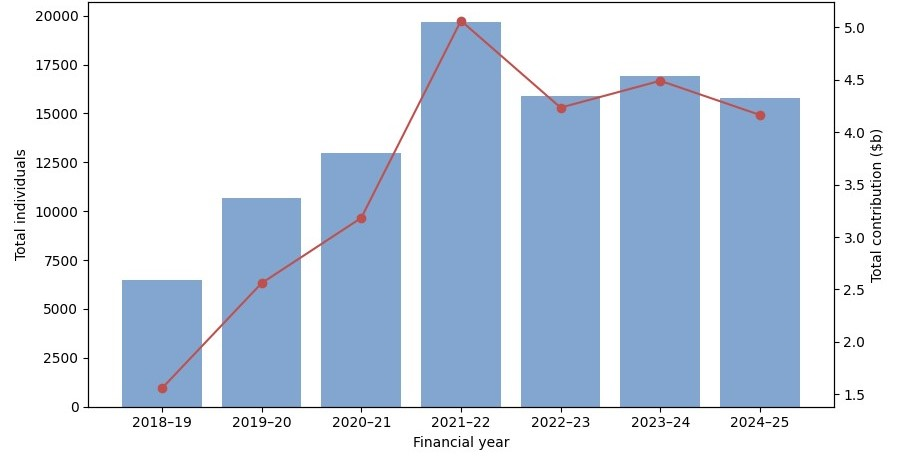 Total individuals and downsizers contributions by financial year